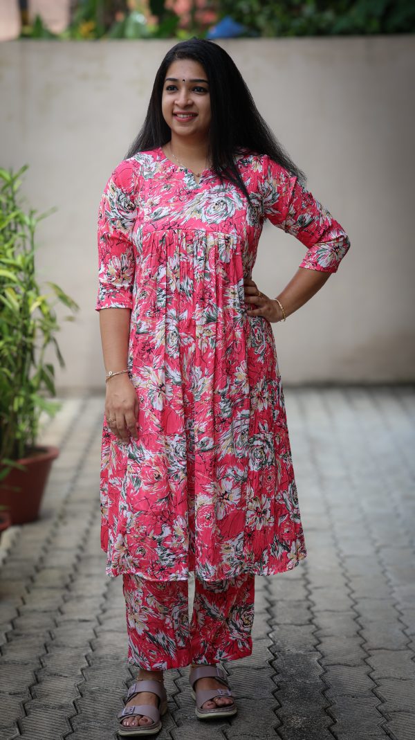 -Highlights : Floral Print throughout the Top & Bottom. Elastic bottom. Small pleats at yoke portion