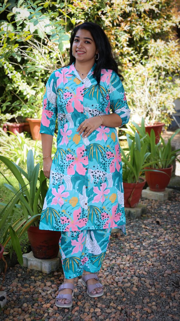 – Highlights- Floral Digital Print on Top & Bottom. Round collar neck & Elastic bottom .First two button openable