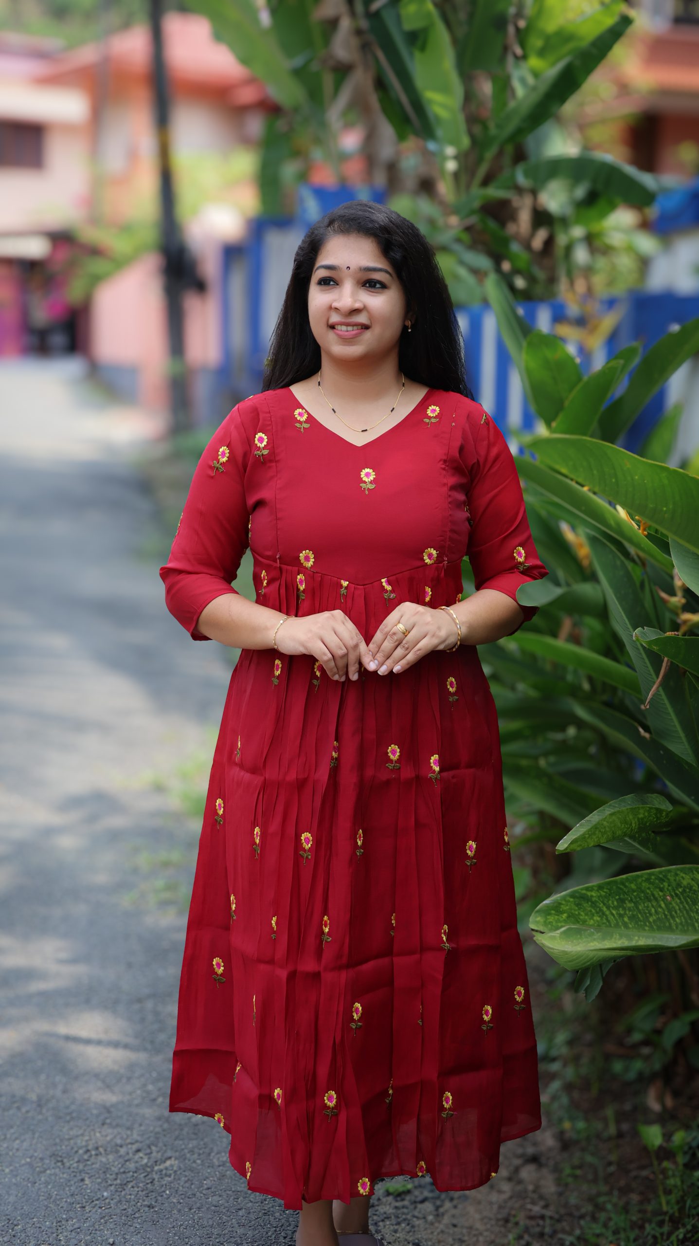 – Highlights- Floral Embroidery work throughout top. Pleats given on center portion & V neck